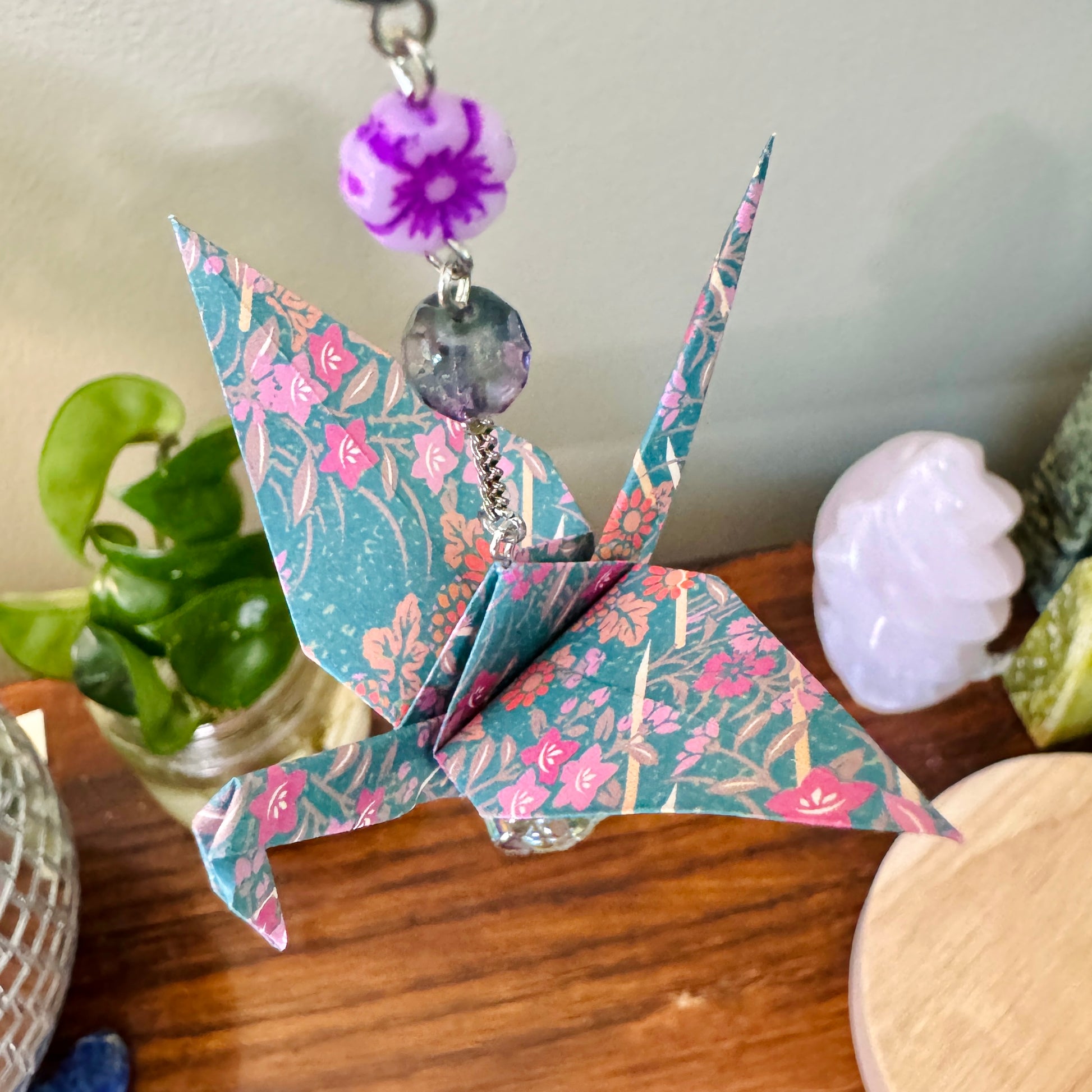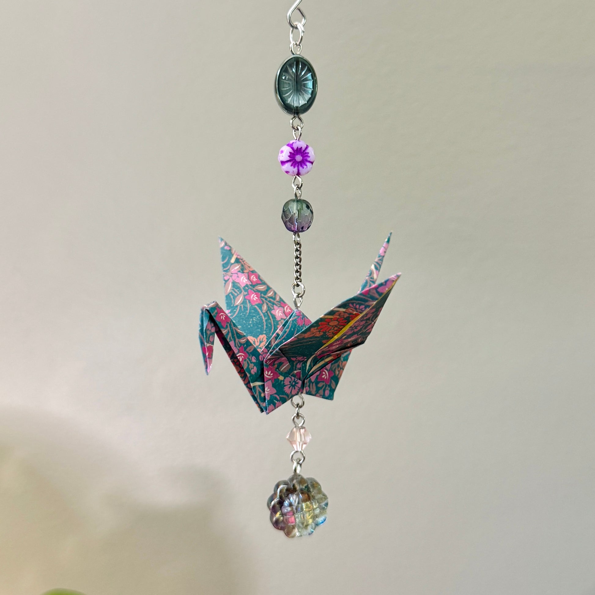 Hand crafted ornament made with origami paper cranes, beads, and jewelry. Origami is the Japanese art of paper folding. All origami is hand folded by me using fade-resistant origami paper.