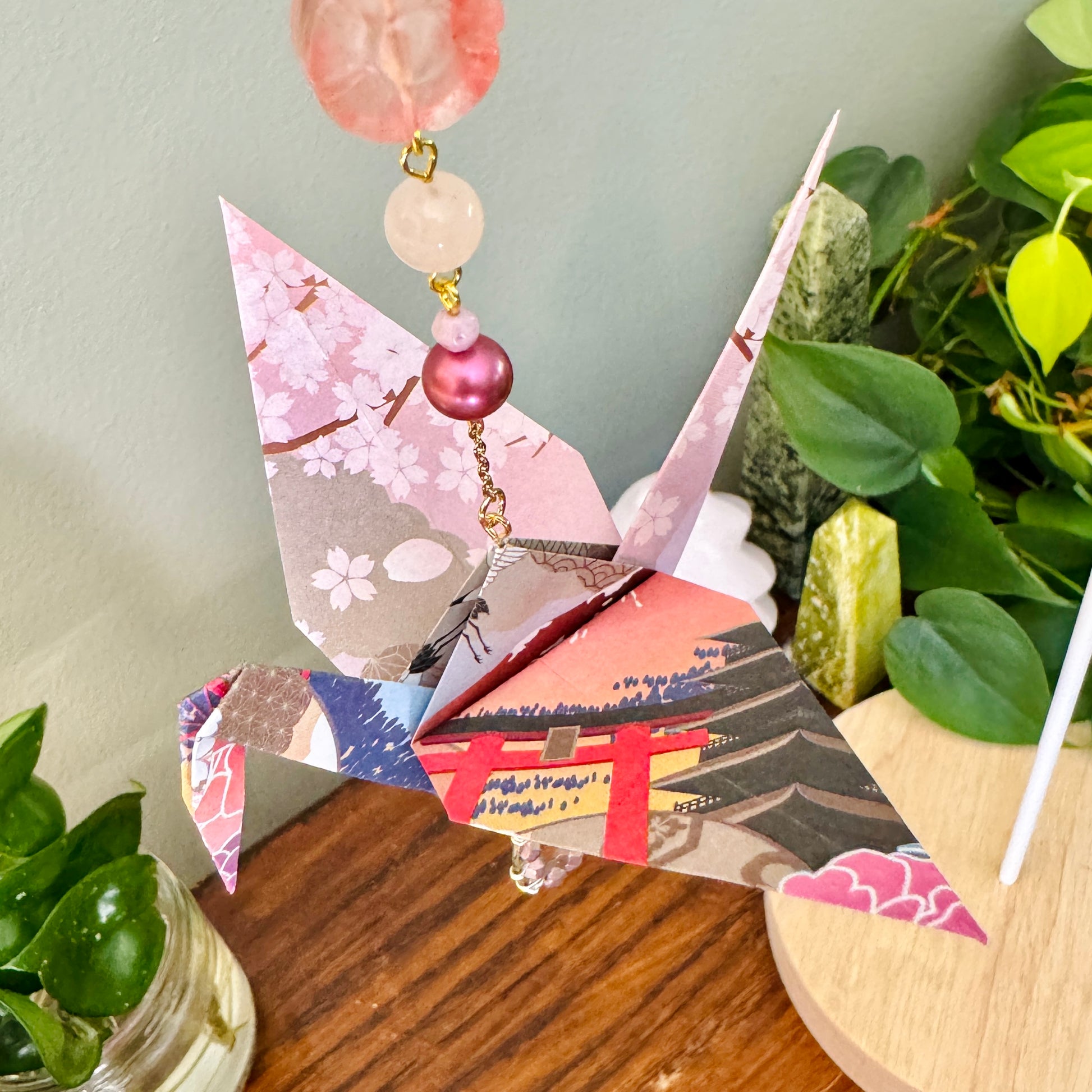 Hand crafted ornament made with origami paper cranes, beads, and jewelry. Origami is the Japanese art of paper folding. All origami is hand folded by me using fade-resistant origami paper.
