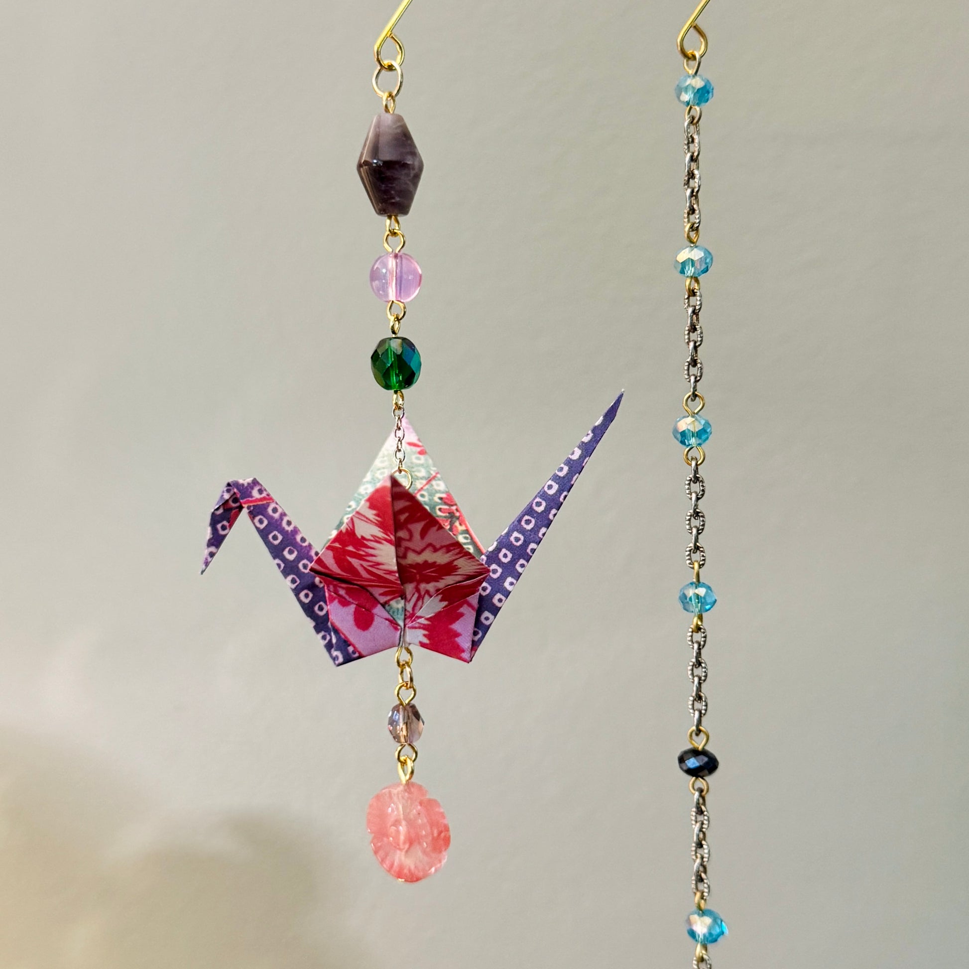 Medium cranes are folded from 4”x4” paper, with a finished height of 2” and an open wingspan of 3.5”. Total hanging length of ornament varies with materials used. See last two pictures for length.