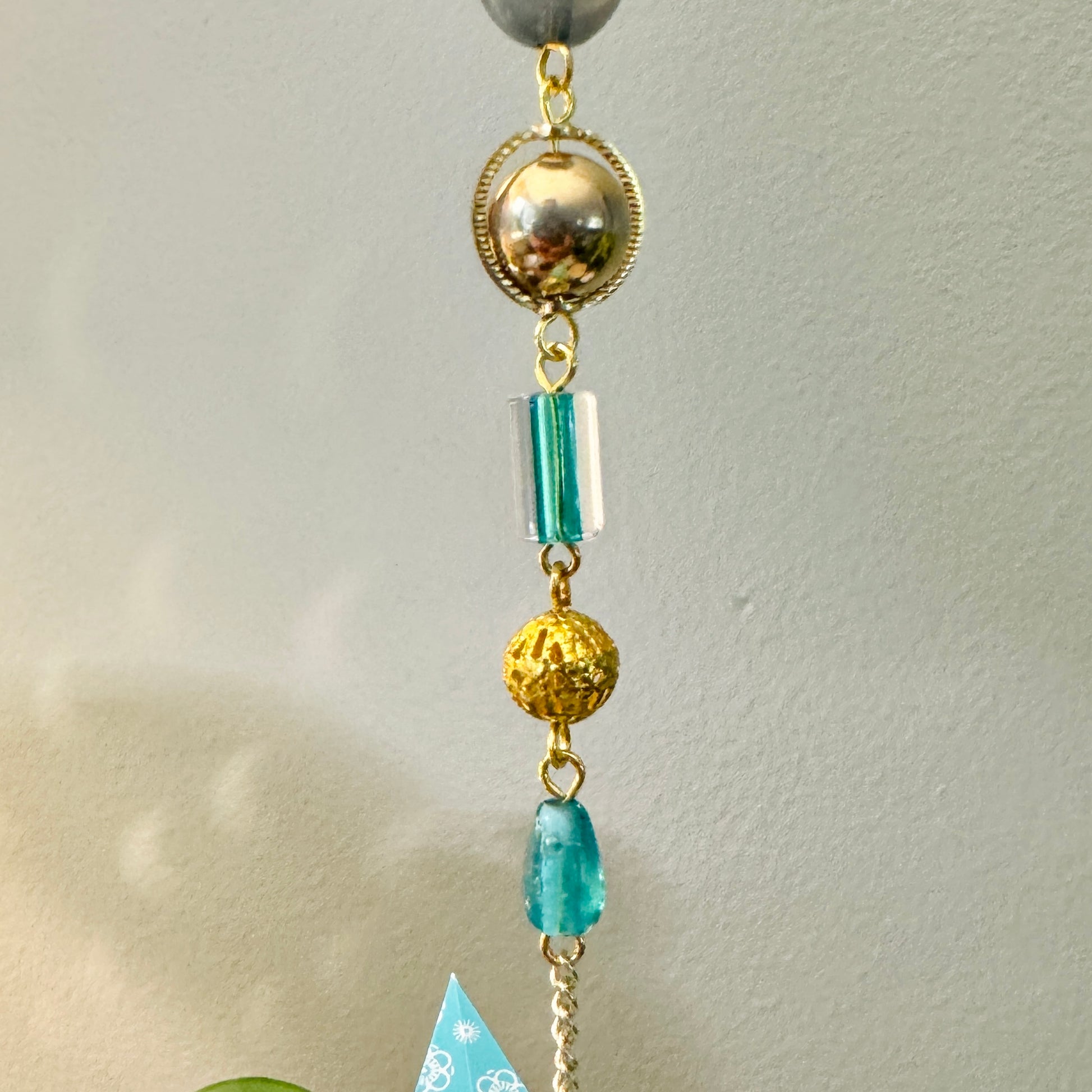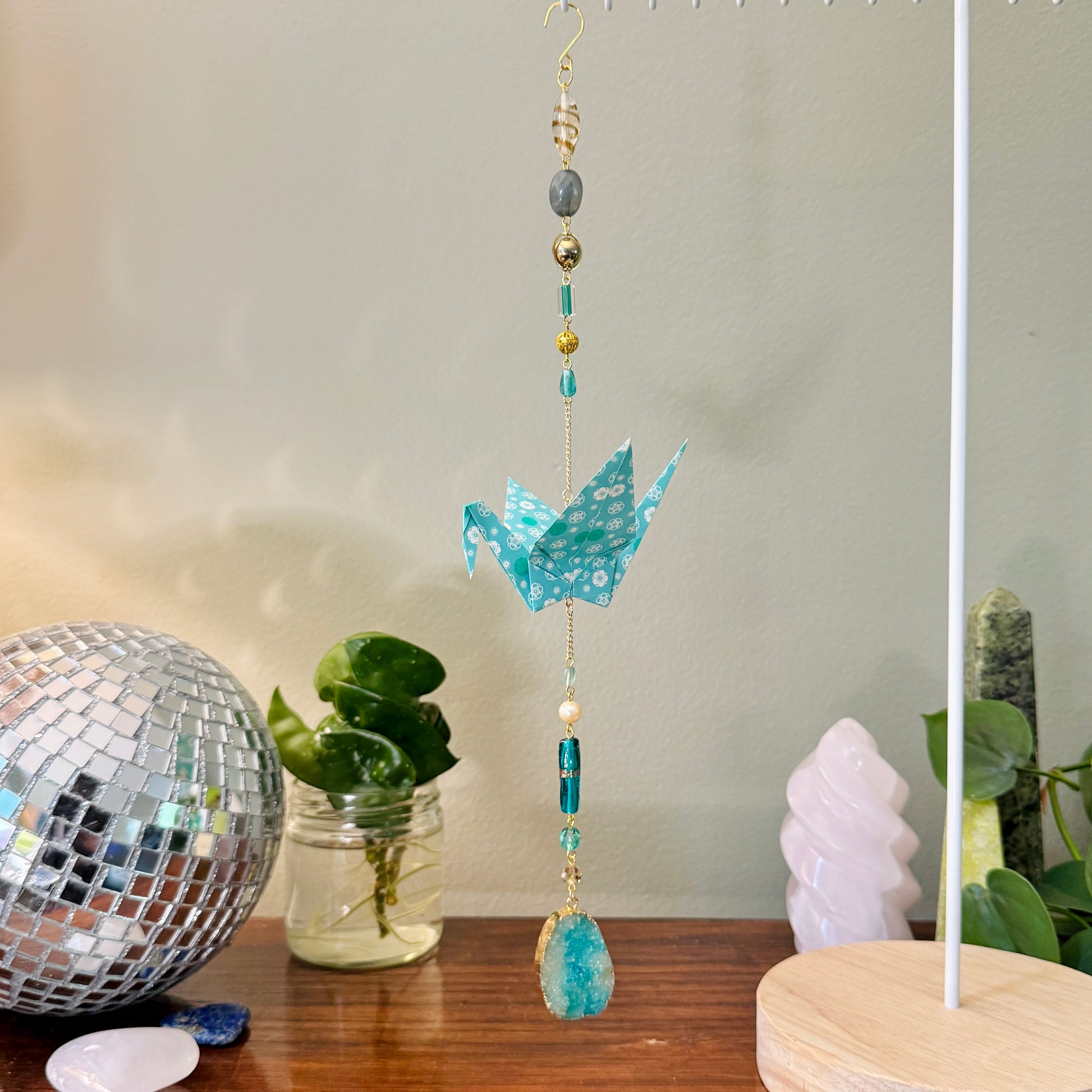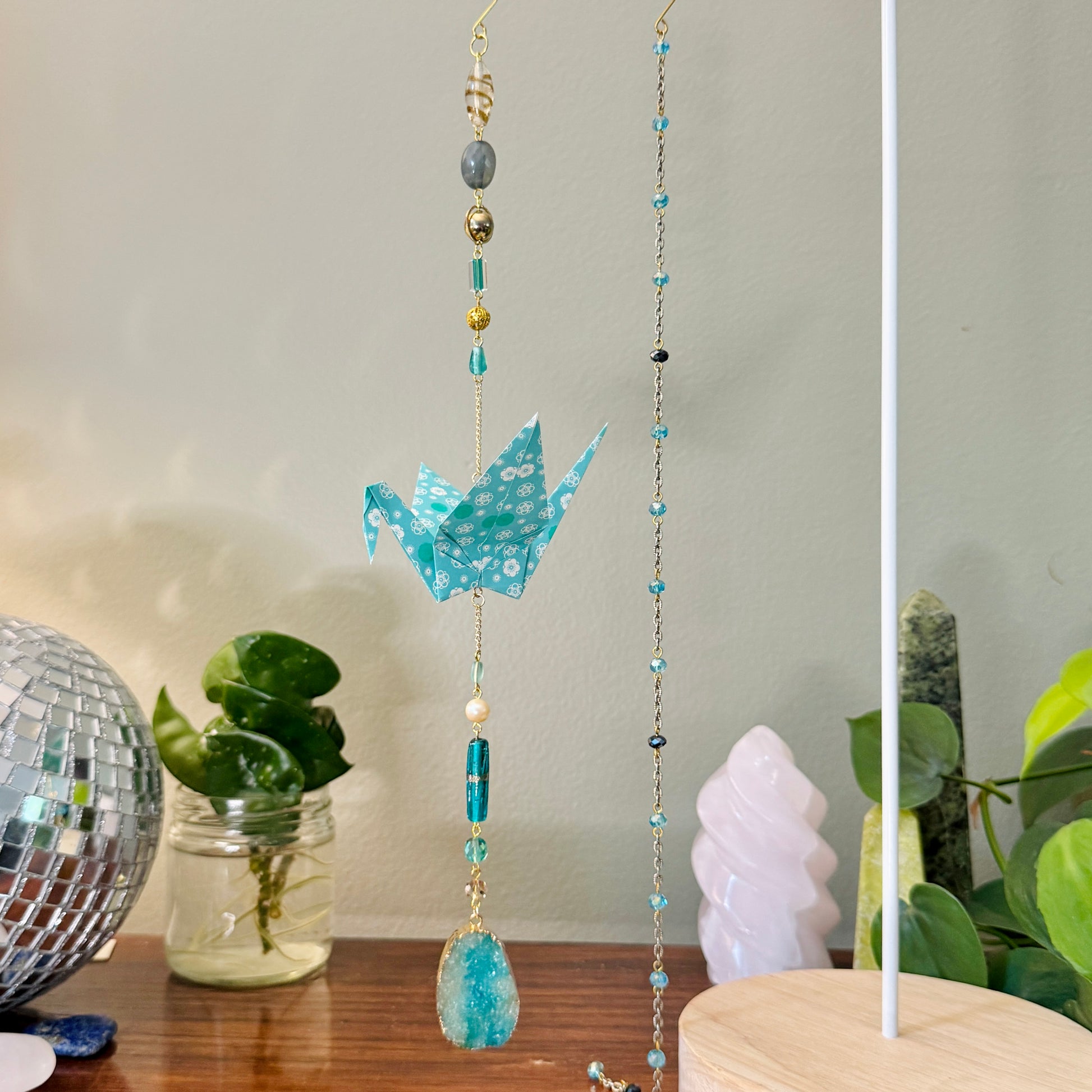 Hand crafted ornament made with origami paper cranes, beads, and jewelry.