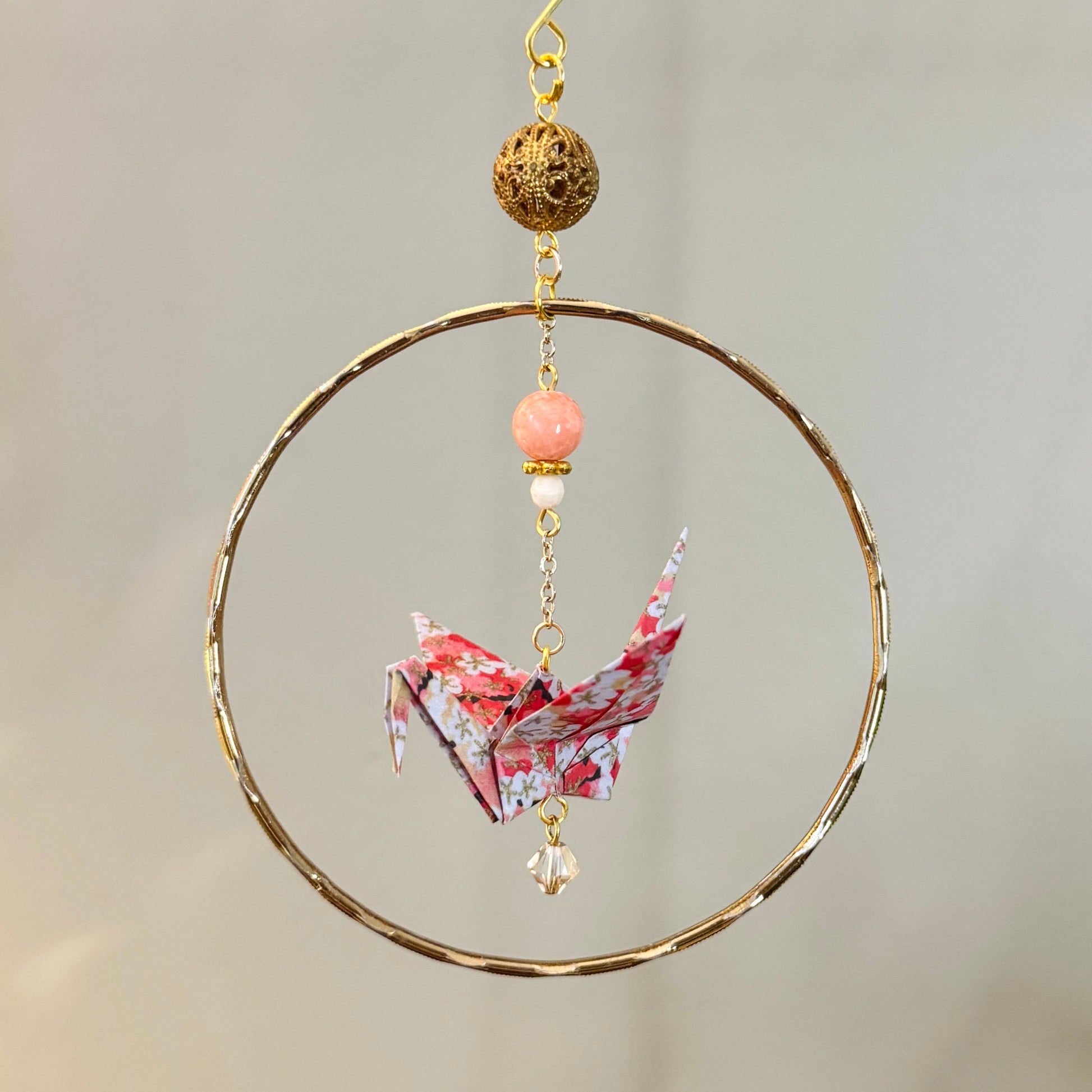 Hand crafted ornament made with origami paper cranes, beads, and jewelry.